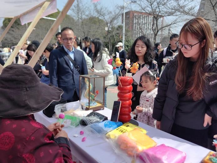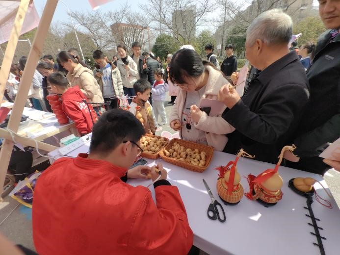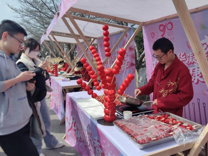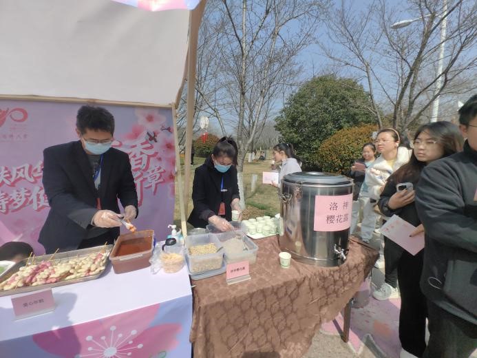开幕式现场人头攒动,后勤集团特色美食与民俗技艺展区更是成为人气焦点。糖葫芦、樱花糕、青团、洛神樱花露等美食,将春日气息与传统食韵巧妙结合,引来众多师生驻足品尝。后勤集团还特邀多位民间手工艺人,在现场展示糖画、捏面人、葫芦刻字等民俗技艺,让师生在感受烟火气的同时增进文化认同,为紧张的学习科研生活增添温馨趣味。欢声笑语中,处处彰显后勤服务的用心与温度。